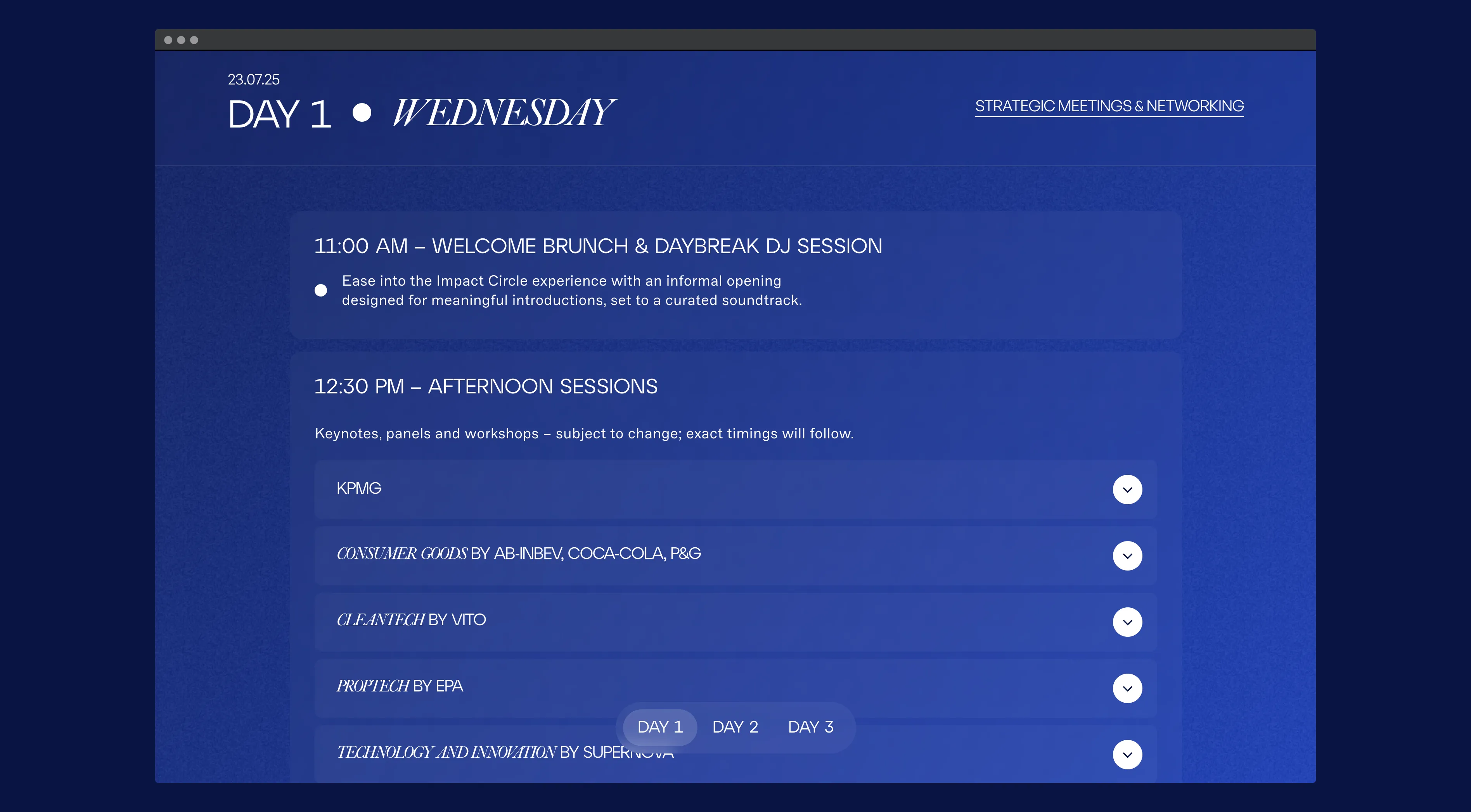 With three days of roundtables, pitching sessions, and Tomorrowland networking activations, content complexity was high. We designed a dynamic schedule, tailored “Circles” overview, and “Why Attend” storytelling, enabling each audience (startups, investors, corporates) to find their pathway smoothly. Whether viewing the agenda, exploring Circles or learning why they should attend, every step is clear and concise.