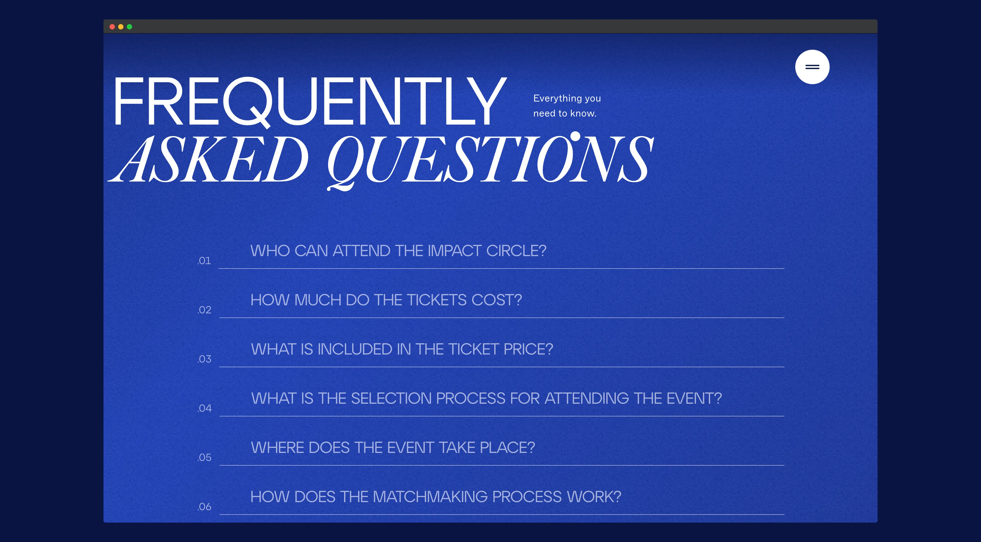 When we were approached to design the website, the expectations were clear: create a digital platform that felt just as exclusive and immersive as the event itself. With The Impact Circle’s new visual identity and branding guidelines in place, it was crucial to translate that identity into a seamless and responsive user experience. Short deadlines, responsive user experience, subtle interactivity and full alignment with the brand’s vision . The result? A high-end, dynamic website that blends the event’s atmosphere and keeps users engaged with every scroll, naturally leading them toward the waitlist signup.